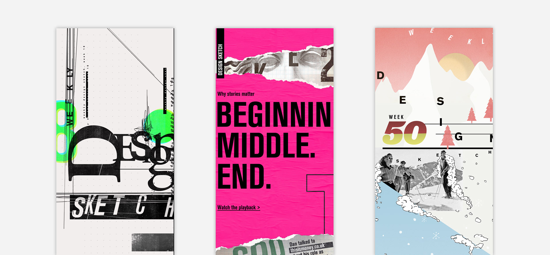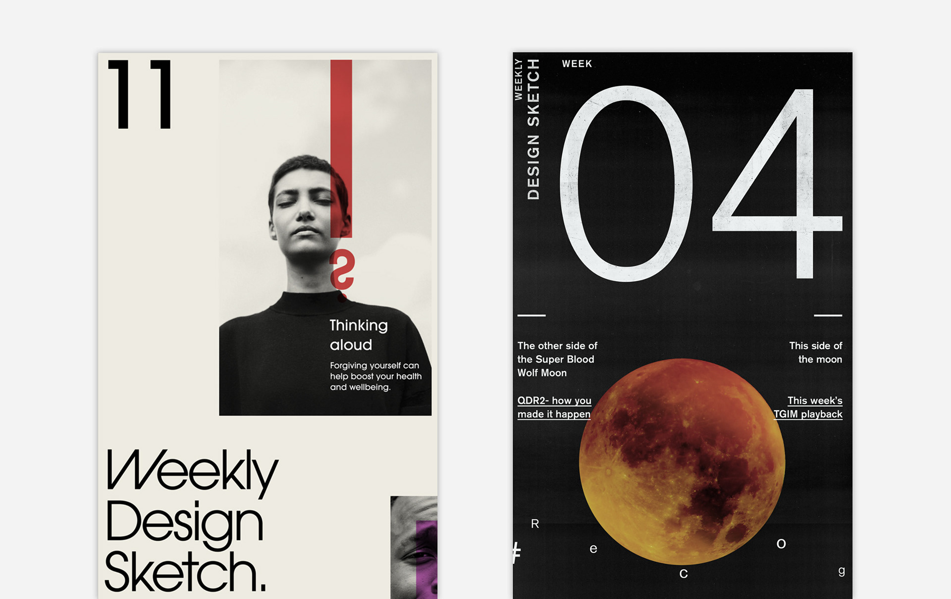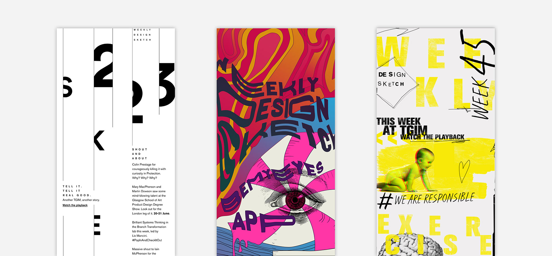 A series of typographic experiments, used for a weekly email. Each one was created from scratch in just a few hours. Examples given here are crops of a bigger artwork.